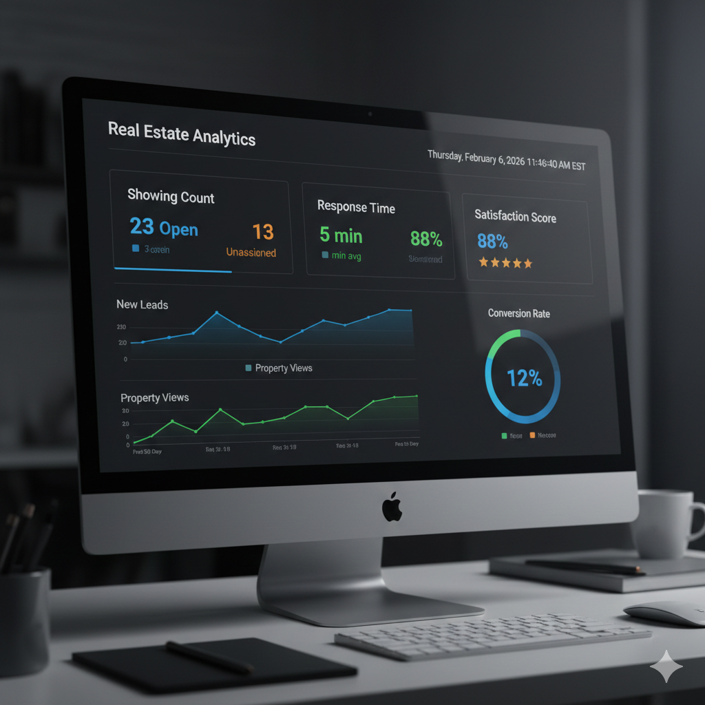 Live showing count (23 scheduled), response time (5 min average), satisfaction score (88%), performance trends
